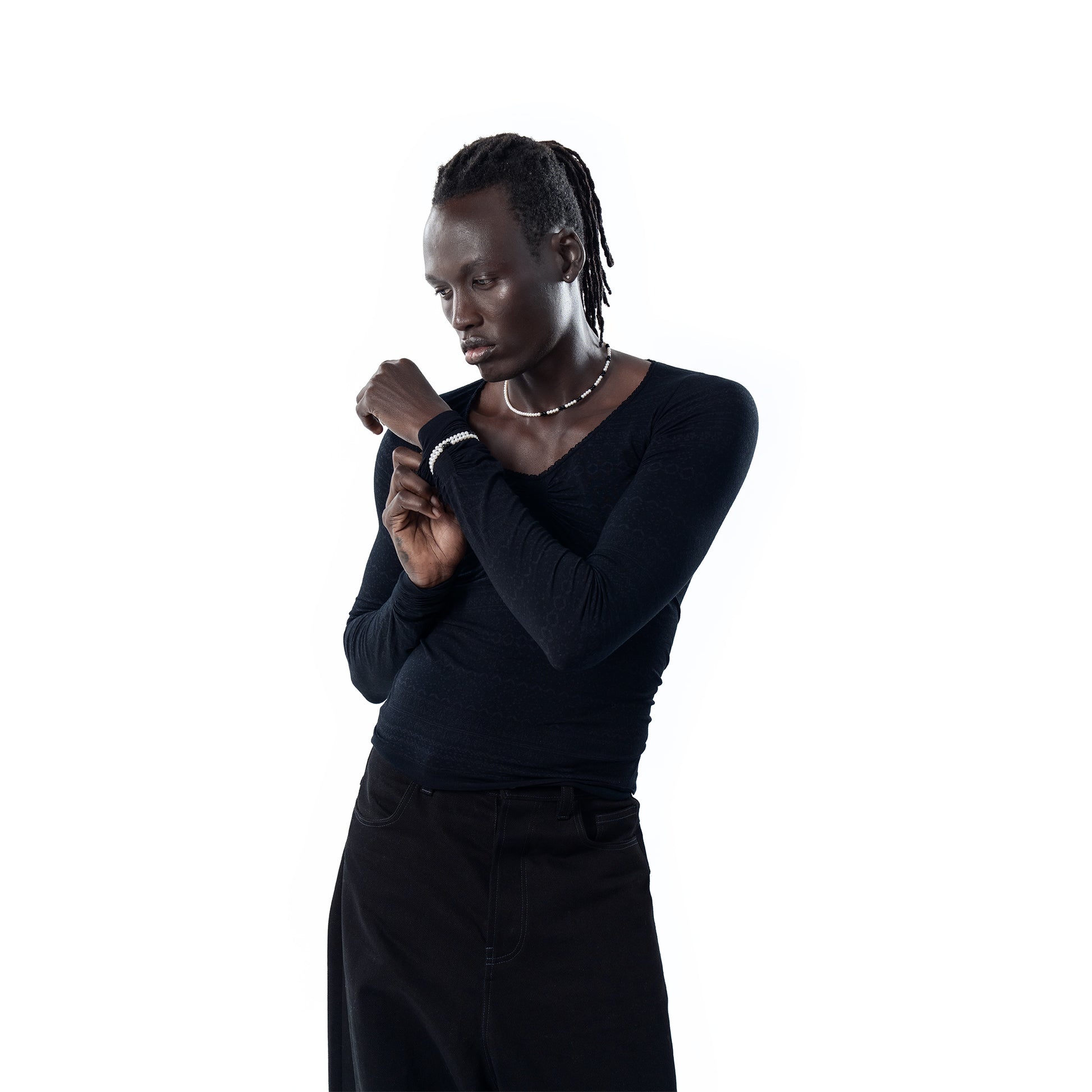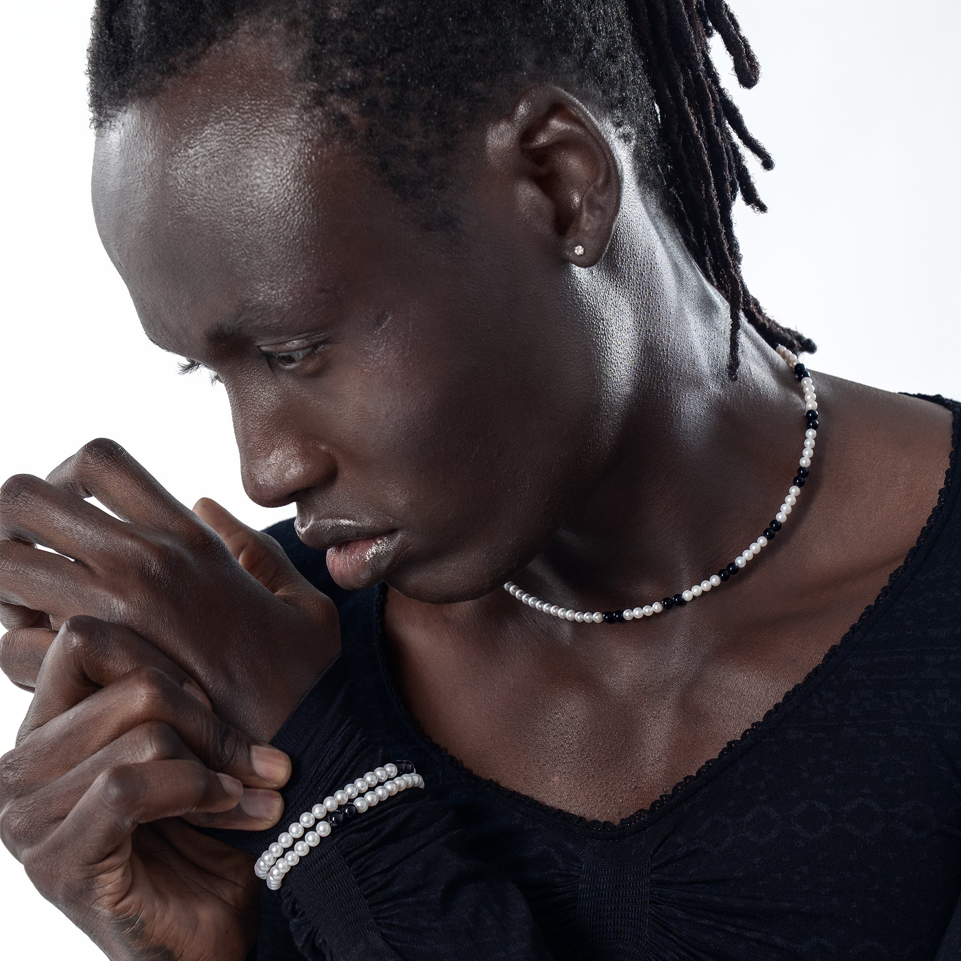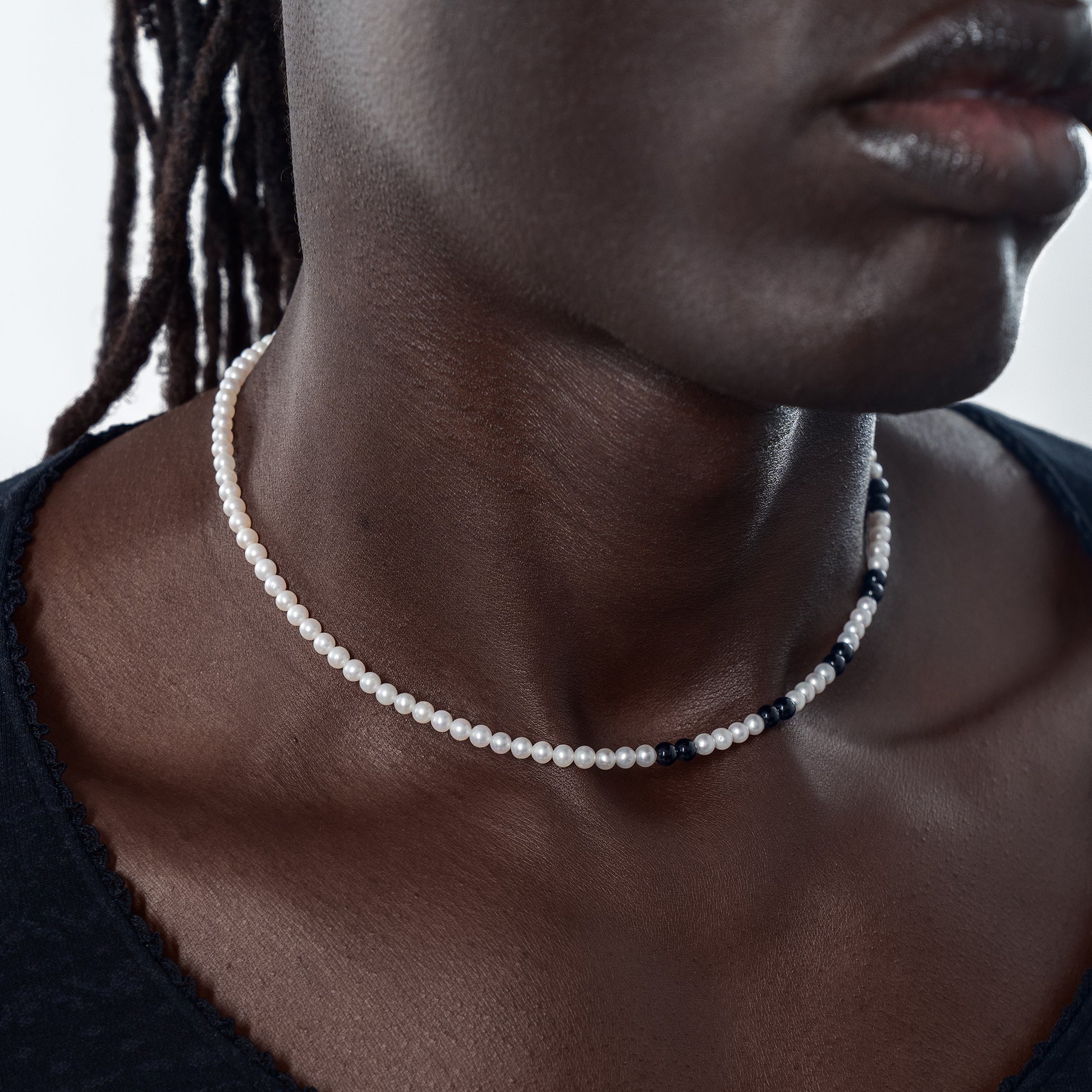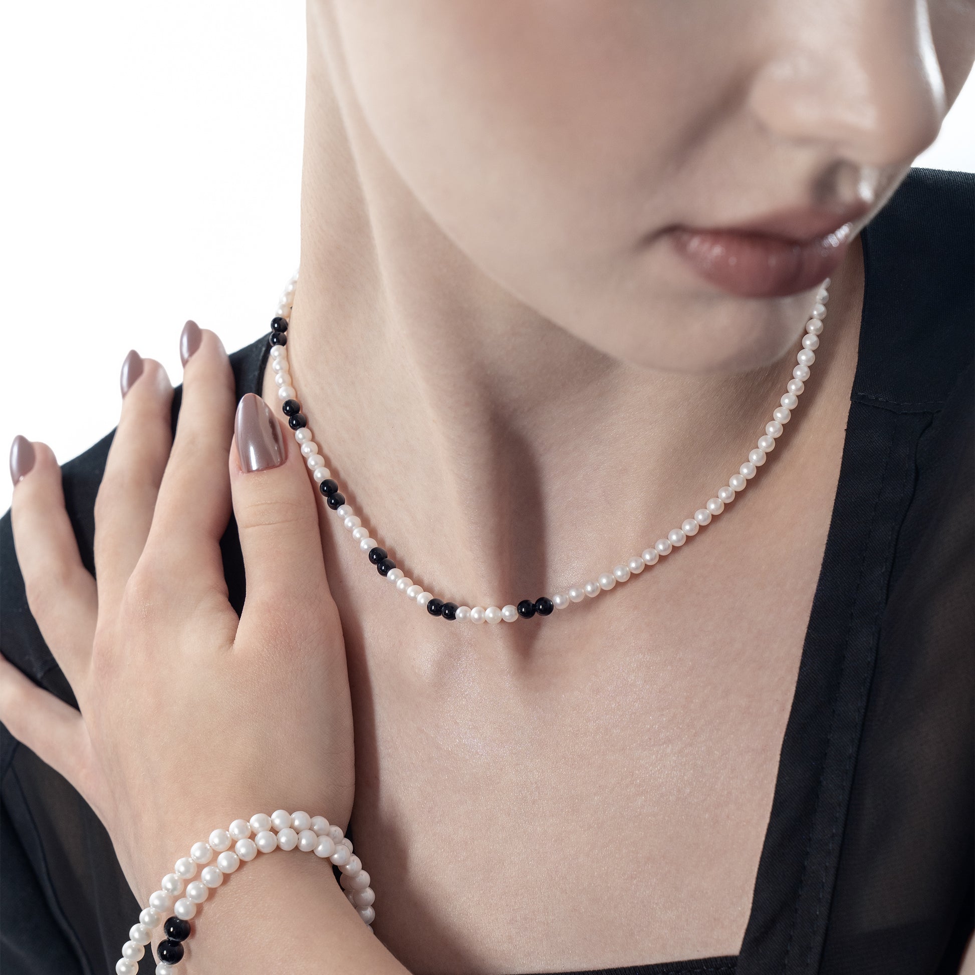 AAA very high lustre freshwater pearls, paired with onyx.